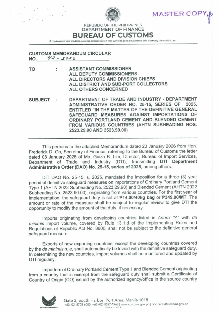 The circular enforces Department Administrative Order No. 25-15, issued by the Department of Trade and Industry, which imposes definitive general safeguard measures on imports of Ordinary Portland Cement Type 1 and Blended Cement from various countries for three years.